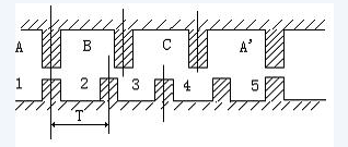 電機(jī)轉(zhuǎn)子均勻分布著很多小齒,定子齒有三個(gè)勵(lì)磁繞阻,其幾何軸線依次分別與轉(zhuǎn)子齒軸線錯(cuò)開(kāi)。0、1/3て、2/3て,(相鄰兩轉(zhuǎn)子齒軸線間的距離為齒距以て表示),即A與齒1相對(duì)齊,B與齒2向右錯(cuò)開(kāi)1/3て,C與齒3向右錯(cuò)開(kāi)2/3て,A'與齒5相對(duì)齊,(A'就是A,齒5就是齒1)下面是定轉(zhuǎn)子的展開(kāi)圖: